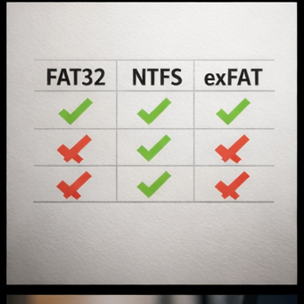 FAT32는 범용성이 가장 뛰어납니다. 차량 블랙박스, 스마트 TV, 구형 장비 등과의 호환성이 높습니다. 그러나 4GB 파일 제한이 존재합니다.