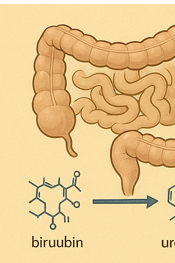 그런데 여기서 끝이 아닙니다! 우리 몸속 장 안에는 엄청 많은 미생물들이 살고 있어요. 특히 대장에서 활동하는 미생물들 중에는 ‘빌리루빈 환원효소(bilirubin reductase)’라는 효소를 만드는 녀석들이 있어요. 이 효소는 간에서 만들어진 빌리루빈을 다시 다른 물질로 바꿔서, 우리 몸 밖으로 잘 나갈 수 있게 도와주는 역할을 해요.