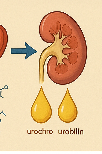 이 효소 덕분에 빌리루빈이 ‘유로빌리노겐(urobilinogen)’이라는 상태가 되는데, 일부는 대변으로 나가고, 일부는 혈관을 통해 다시 몸을 한 바퀴 돌아 소변으로 나와요. 그 과정에서 유로빌린으로 바뀌고, 이게 또 소변의 노란빛을 만들어주는 데 톡톡히 기여하죠.