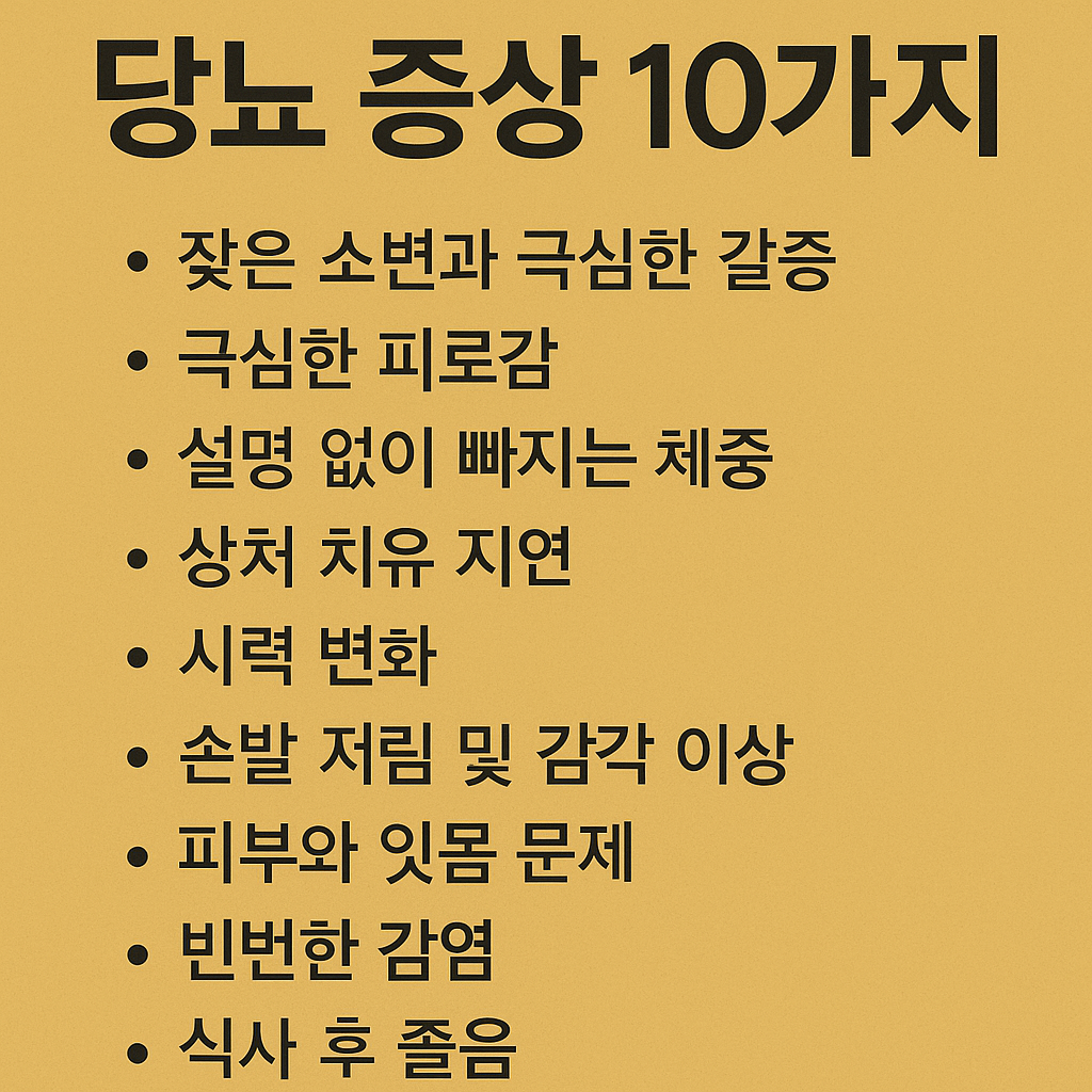 목차1.서론2. 잦은 갈증과 다뇨3. 극심한 피로감4. 체중 감소5. 상처 치유 지연6. 시력 변화7. 손발 저림 및 감각 이상8. 피부와 잇몸 문제9. 빈번한 감염10. 식사 후 졸음11. 불규칙한 식욕 변화12. 결론 1.서론당뇨병이란 무엇인가당뇨병은 우리 몸이 음식을 통해 얻은 포도당을 제대로 사용하지 못해서 생기는 질환이에요. 우리의 에너지원인 포도당이 세포로 들어가기 위해서는 인슐린이라는 호르몬이 꼭 필요한데요. 이 인슐린이 부족하거나, 제 역할을 제대로 못 하면 포도당은 혈액 속에 남아 있게 되고, 결국 소변으로 배출되어 ‘달콤한 소변’이라는 특징이 생기게 됩니다. 이런 상태가 바로 당뇨병이에요 .당뇨병은 크게 네 가지로 나뉘는데요:1형 당뇨병: 췌장에서 인슐린을 거의 또는 전혀 만들지 못하는..