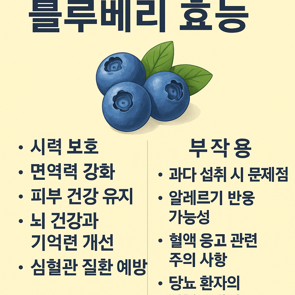 목차1.블루베리란 무엇인가2.블루베리의 주요 영양소3.블루베리의 효능4.블루베리의 부작용5.블루베리 섭취 방법결론1.블루베리란 무엇인가블루베리의 정체블루베리는 북아메리카가 원산지인 작은 나무, 즉 관목으로서, 진한 파란 보랏빛 열매를 맺는 과일이에요 .겉에 은은하게 묻은 흰 가루는 ‘블룸’이라고 불리는데, 이게 과일이 신선하다는 표시랍니다.블루베리는 어디서 왔나요?옛날 사람들은 겨울에 말린 블루베리를 먹으며, 건강을 챙기기도 했고요 .최근에는 이 블루베리가 ‘슈퍼푸드’로 떠오르며 많은 주목을 받고 있어요 .블루베리가 주목받는 이유강력한 항산화 효과블루베리가 보이는 보랏빛의 비밀은 안토시아닌이라는 색소 덕분이에요.이 안토시아닌은 항산화력이 정말 뛰어나서, 우리 몸속 나쁜 활성산소를 없애주고 노화 방지에도 ..