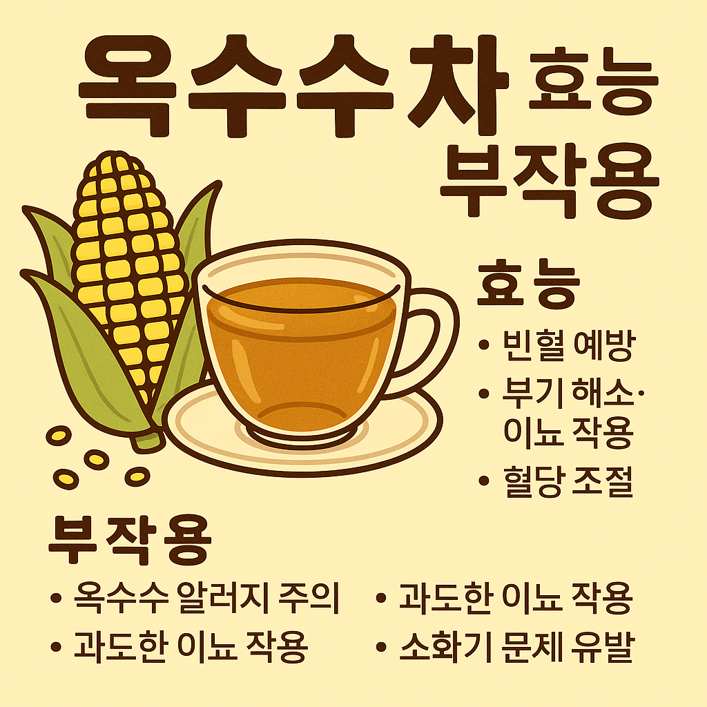 목차1.옥수수차란?2.주요 성분3.효능4.보리차 등 다른 곡차와 비교5.주의사항 및 부작용6.안전한 섭취 가이드7.끓이는 방법 / 보관 팁8.마무리 요약1.옥수수차란?옥수수차 정의 (볶은 옥수수 알갱이를 우려낸 전통 곡차)옥수수차는 말 그대로 ‘옥수수로 만든 차’예요. 근데 그냥 옥수수로 끓인 게 아니라, 잘 익은 옥수수 알갱이를 말려서 노릇하게 볶은 다음, 그걸 뜨거운 물에 우려내는 방식이죠. 이게 또 은근히 고소하고 구수한 맛이 살아 있어서, 여름에도 겨울에도 자주 찾게 되는 음료 중 하나랍니다.특히 한국에서는 예전부터 곡차(穀茶)라고 해서 곡물을 이용한 차를 즐겨 마셨는데, 그중에서도 옥수수차는 기름기 없고 깔끔한 맛 때문에 남녀노소에게 사랑을 많이 받아왔어요. 밥 먹고 나서 입가심으로 한 잔 마시..
