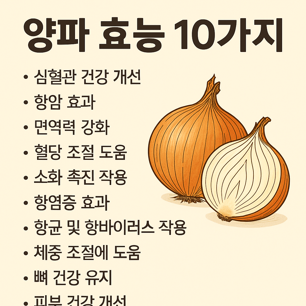 목차1. 심혈관 건강 개선2. 항암 효과3. 면역력 강화4. 혈당 조절 도움5. 소화 촉진 작용6. 항염증 효과7. 항균 및 항바이러스 작용8. 체중 조절에 도움9. 뼈 건강 유지10. 피부 건강 개선1. 심혈관 건강 개선콜레스테롤 수치 조절양파에는 알리신이라는 특별한 성분이 있어요. 이 성분이 혈액 속 나쁜 콜레스테롤(LDL)이 쌓이는 것을 줄여주는 역할을 해요. 마치 찌꺼기가 쌓여서 막히는 배수관을 청소해 주듯이, 혈관 안도 깨끗하게 유지해 주는 거죠. 게다가 칼륨도 풍부해서 염분 배출에 도움을 주니, 이중으로 콜레스테롤을 낮추는 효과가 있는 거예요.혈압 안정에 도움양파는 플라보노이드라는 항산화 물질도 많은데요, 이게 혈관을 부드럽게 해 주는 효과가 있어요. 부드러운 혈관은 혈압이 급하게 올라가는 걸..